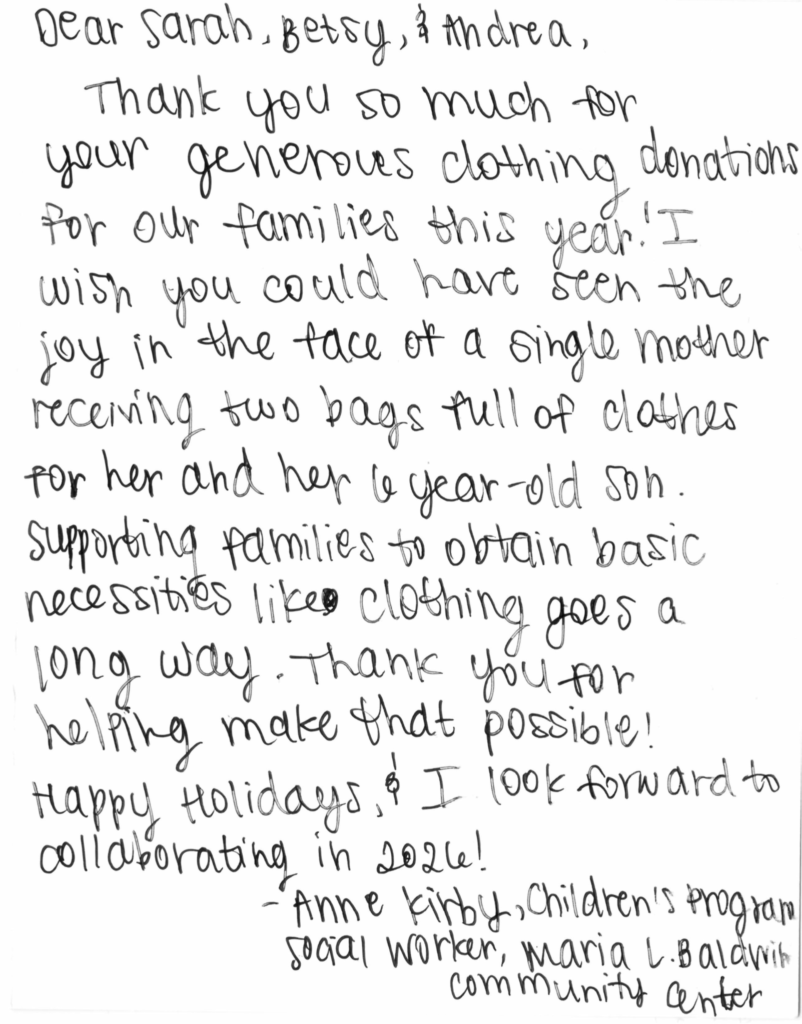 - Get clothing, shoes, and accessories to community members who need them the most by working with local provider partners;